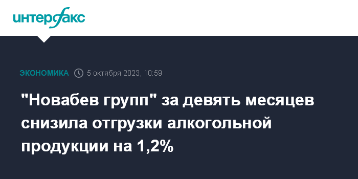 Москва. 5 октября. INTERFAX.RU - ПАО "Новабев групп" (бывшее ПАО "Белуга групп"), один из ведущих производителей алкогольной продукции в РФ, в январе-сентябре 2023 года отгрузило 11 млн декалитров (дал) продукции, что на 1,2% меньше, чем годом ранее, сообщается в пресс-релизе компании.