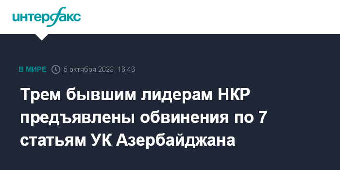 Москва. 5 октября. INTERFAX.RU - Бывшим главам лидерам непризнанной Нагорно-Карабахской Республики Аркадию Гукасяну, Бако Саакяну, бывшему спикеру парламента НКР Давиду Ишханяну предъявлены обвинения по семи статьям Уголовного кодекса Азербайджана.