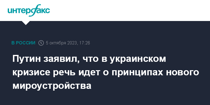 Москва. 5 октября. INTERFAX.RU - Президент РФ Владимир Путин заявил, что украинский кризис не является территориальным конфликтом, речь идет о базовых принципах нового мироустройства.