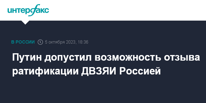 Москва. 5 октября. INTERFAX.RU - Президент Владимир Путин допустил возможность отзыва Москвой ратификации Договора о всеобъемлющем запрещении ядерных испытаний (ДВЗЯИ), который подписали и Россия, и США, но Вашингтон не ратифицировал.