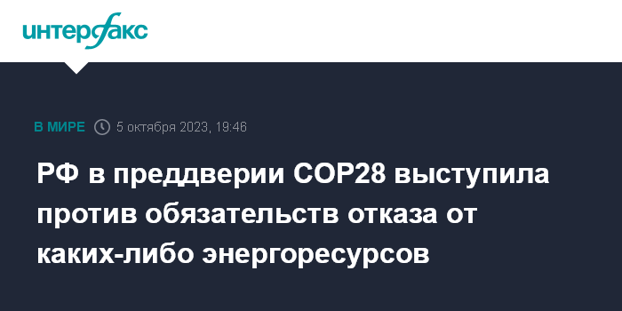 РФ в преддверии COP28 выступила против обязательств отказа от каких-либо энергоресурсов