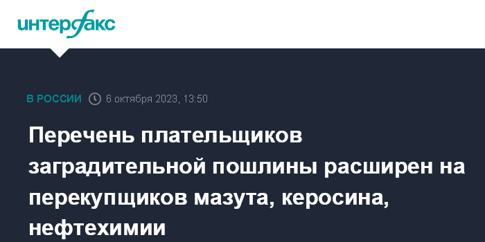 Перечень плательщиков заградительной пошлины расширен на перекупщиков мазута, керосина, нефтехимии