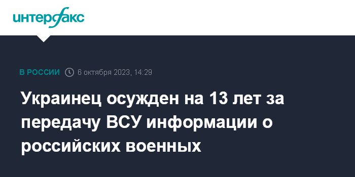 Москва. 6 октября. INTERFAX.RU - Гражданин Украины Сергей Цыгипа приговорен к 13 годам колонии строгого режима за передачу ВСУ и СБУ информации о российских военных, их передвижениях и технике, сообщает в пятницу Центр общественных связей (ЦОС) ФСБ РФ.