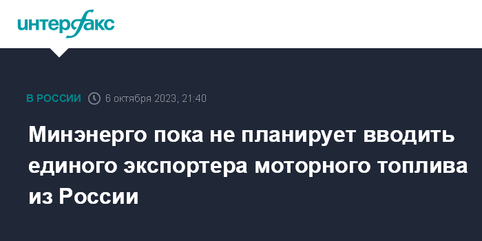 Москва. 6 октября. INTERFAX.RU - Министерство энергетики пока не планирует вводить единого экспортера бензина и дизельного топлива, принятые меры уже положительно сказываются на ценах на внутреннем рынке, сообщил журналистам глава ведомства Николай Шульгинов по итогам российско-узбекистанских переговоров.