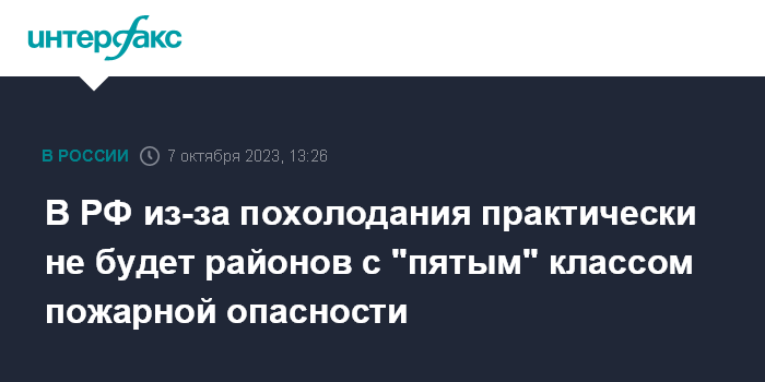 Москва. 7 октября. INTERFAX.RU - В начале следующей недели из-за понижения температуры в стране практически не останется территорий с чрезвычайным, "пятым" классом пожарной опасности, сообщил "Интерфаксу" научный руководитель Гидрометцентра России Роман Вильфанд.