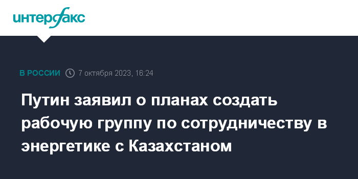 Москва. 7 октября. INTERFAX.RU - Президент России Владимир Путин сообщил о планах создать рабочую группу, которая займется изучением перспектив расширения энергетического сотрудничества с Казахстаном и регионом в целом.