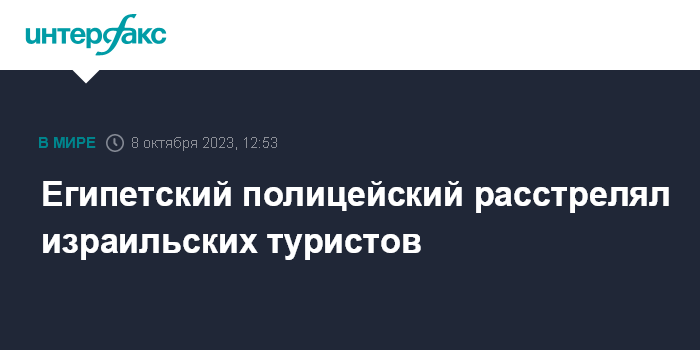 Москва. 8 октября. INTERFAX.RU - Полицейский в Египте открыл огонь по туристам из Израиля в Александрии, сообщает Associated Press. Убиты два израильтянина и один египтянин. Такие данные приводит МВД Египта.