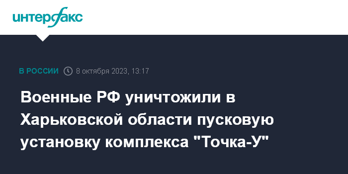 Москва. 8 октября. INTERFAX.RU - Российские военные за минувшие сутки уничтожили в Харьковской области украинскую пусковую установку ракетного комплекса "Точка-У", в Николаевской области - установку системы ПВО С-300, заявил официальный представитель министерства обороны РФ Игорь Конашенков.
