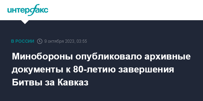 Москва. 9 октября. INTERFAX.RU - Министерство обороны России запустило мультимедийный проект с архивными документами к 80-летию со дня завершения Битвы за Кавказ в годы Великой Отечественной войны.