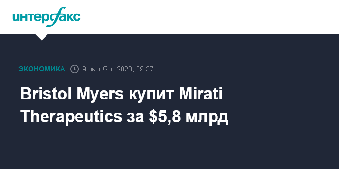 Москва. 9 октября. INTERFAX.RU - Американская фармацевтическая компания Bristol Myers Squibb покупает разработчика препаратов для лечения онкологических заболеваний Mirati Therapeutics, сумма сделки составит $5,8 млрд.