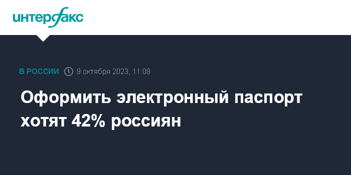 Москва. 9 октября. INTERFAX.RU - Оформить себе электронный паспорт хотели бы в настоящее время 42% россиян, тогда как в 2020 году этого хотел лишь каждый шестой (16%), свидетельствуют данные опроса ВЦИОМ, опубликованные в понедельник на сайте социологического центра.
