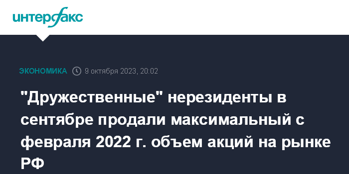 "Дружественные" нерезиденты в сентябре продали максимальный с февраля 2022 г. объем акций на рынке РФ