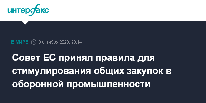 Москва. 9 октября. INTERFAX.RU - Совет ЕС сообщил в понедельник, что одобрил новые правила об усилении европейской оборонной промышленности посредством закона об общих закупках (EDIRPA).