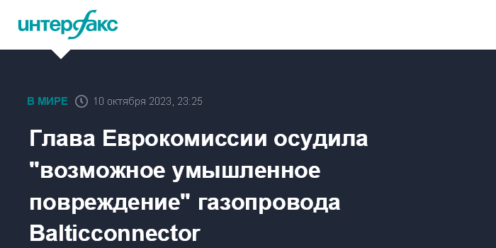 Москва. 10 октября. INTERFAX.RU - Председатель Еврокомиссии (ЕК) Урсула фон дер Ляйен распространила вечером во вторник заявление, в котором осудила предположительно "умышленные повреждения газопровода" Balticconnector и кабеля связи между Финляндией и Эстонией.