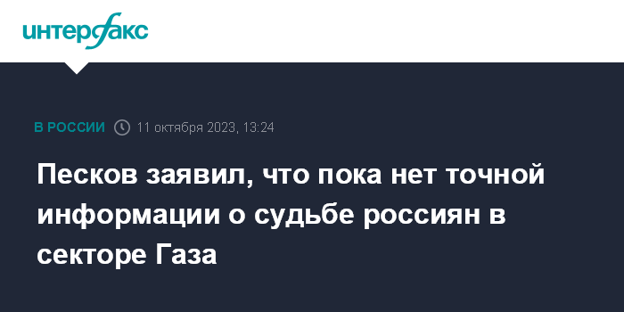 Москва. 11 октября. INTERFAX.RU - Точной информации о судьбе россиян в секторе Газа пока нет, сообщил пресс-секретарь президента РФ Дмитрий Песков.