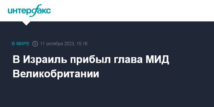 Москва. 11 октября. INTERFAX.RU - В Израиль прибыл министр иностранных дел Великобритании Джеймс Клеверли, сообщает Sky News со ссылкой на заявление Форин-офиса. Министр проведет встречи с представителями руководства Израиля и пострадавшими при терактах.