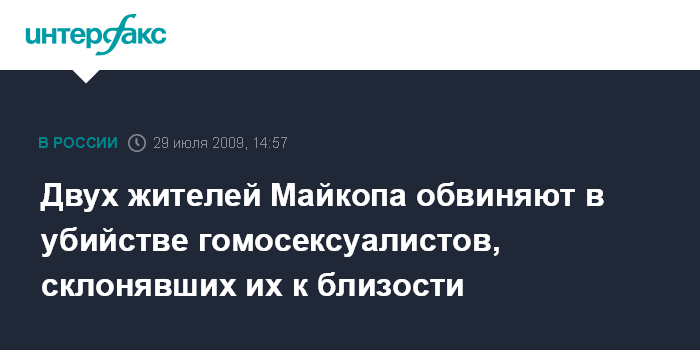Краснодар. 29 июля. INTERFAX.RU - Двум 19-летним жителям Майкопа предъявлено обвинение в убийстве трех человек, которые, по данным следствия, пытались склонить молодых людей к интимной близости.