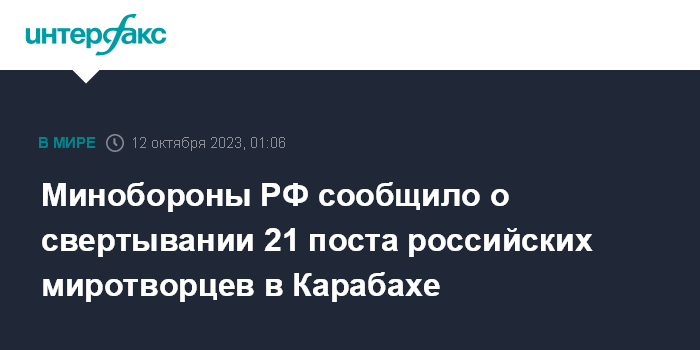 Москва. 12 октября. INTERFAX.RU - Минобороны России сообщило о свертывании шести наблюдательных и 15 временных постов российских миротворцев в Нагорном Карабахе.