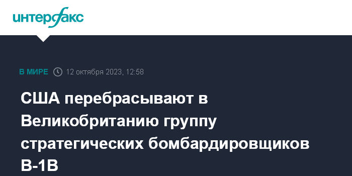 Москва. 12 октября. INTERFAX.RU - На авиабазу Фэрфорд в Англии в четверг ожидается прибытие группы стратегических бомбардировщиков B-1B Lancer "на фоне растущей глобальной нестабильности после эскалации на этой неделе израильско-палестинского конфликта", сообщила новостная служба Gloucestershire Live.