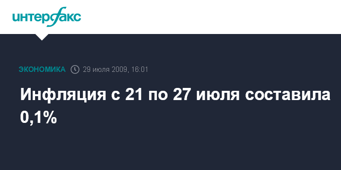 Москва. 29 июля. INTERFAX.RU - Инфляция в РФ с 21 по 27 июля составила 0,1%, говорится в сообщении Росстата. В июле Росстат прогнозирует рост цен на уровне 0,6%.