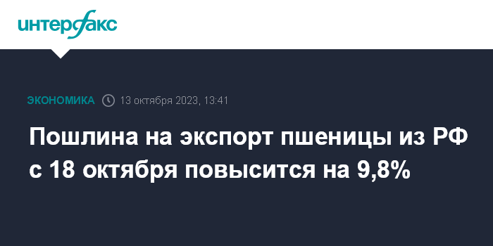 Москва. 13 октября. INTERFAX.RU - Ставка пошлины на экспорт пшеницы из РФ с 18 октября составит 5 734,7 рубля за тонну против 5 224 рубля неделей ранее, сообщает Минсельхоз.