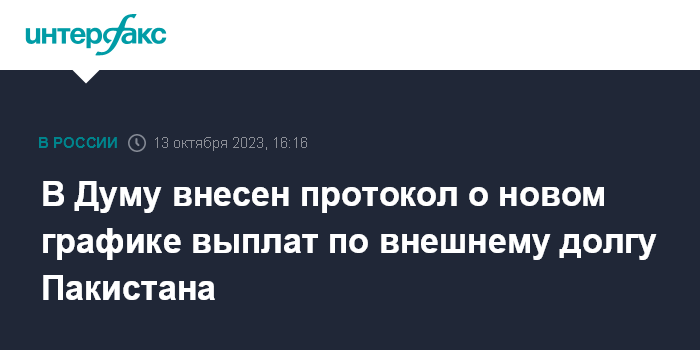 Москва. 13 октября. INTERFAX.RU - Правительство внесло на ратификацию в Госдуму соглашение с новым графиком выплаты долга со стороны Пакистана и его переводом в рубли или юани, документ (№458128-8) размещен в электронной базе данных парламента.
