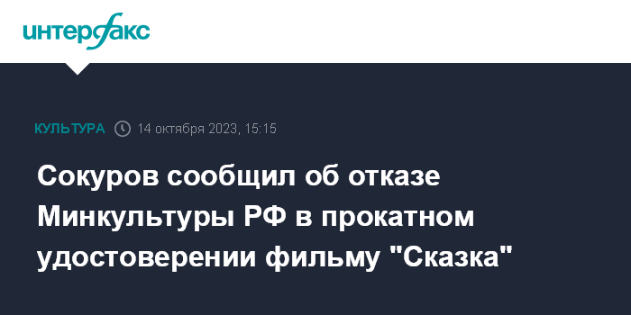 Москва. 14 октября. INTERFAX.RU - Минкультуры РФ отказало в выдаче прокатного удостоверения фильму "Сказка" Александра Сокурова без объяснения причин, сообщил "Интерфаксу" режиссёр.