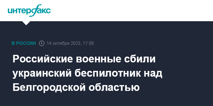 Москва. 14 октября. INTERFAX.RU - Министерство обороны РФ сообщило, что в 17:30 российские силы противовоздушной обороны (ПВО) перехватили украинский беспилотник самолетного типа в Белгородской области.