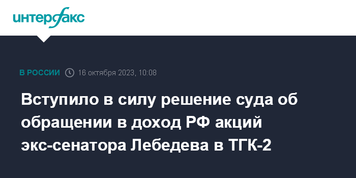 Москва. 16 октября. INTERFAX.RU - Решение Ленинского суда Ярославля об обращении в доход государства принадлежавших бывшему члену Совета Федерации Леониду Лебедеву акций в уставном капитале теплоэнергетической ТГК-2 стоимостью около 80 млрд рублей вступило в силу.