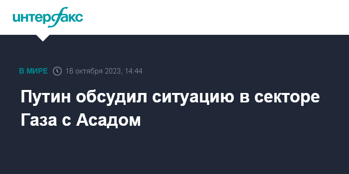 Москва. 16 октября. INTERFAX.RU - Президент Сирии Башар Асад обсудил с российским коллегой Владимиром Путиным варианты урегулирования конфликта между Израилем и ХАМАС, сообщает сирийское агентство САНА.