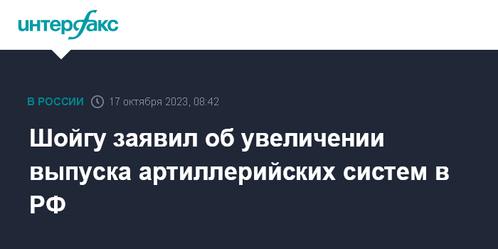 Москва. 17 октября. INTERFAX.RU - Предприятия оборонного-промышленного комплекса наращивают поставки артиллерийских систем в войска, они могут привлекать все резервы, сроки испытаний изделий также сокращены, заявил министр обороны РФ Сергей Шойгу.