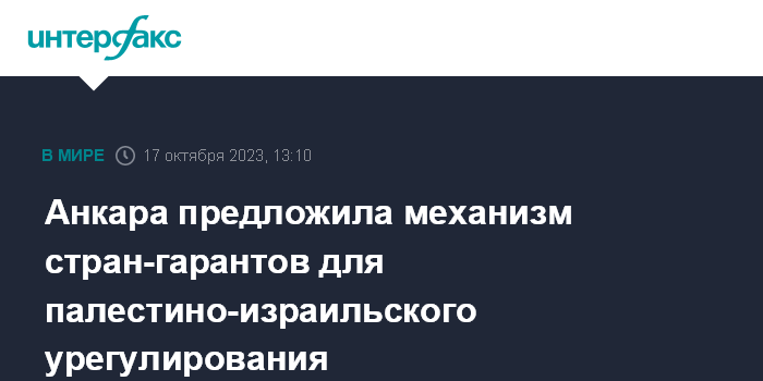 Москва. 17 октября. INTERFAX.RU - Турция предлагает создать систему гарантов в палестино-израильском урегулировании, заявил журналистам глава турецкого МИД Хакан Фидан.