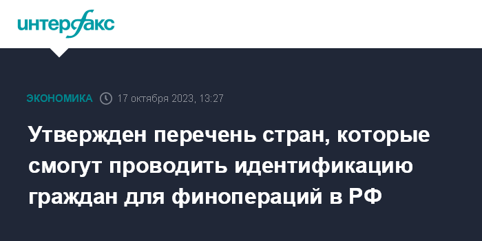 Москва. 17 октября. INTERFAX.RU - Правительство утвердило перечень стран, финансовые организации которых смогут проводить идентификацию граждан для осуществления финансовых операций в России.