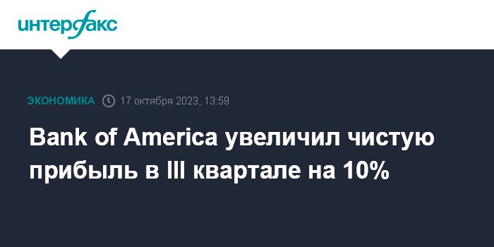 Москва. 17 октября. INTERFAX.RU - Bank of America Corp. (BofA), второй по размеру активов банк США, увеличил чистую прибыль в третьем квартале 2023 года на 10%, выручку - на 3%.