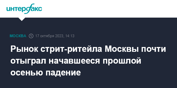 Москва. 17 октября. INTERFAX.RU - Рынок стрит-ритейла Москвы почти отыграл падение, продолжавшееся с осени 2022-го до лета 2023 года, сообщают аналитики SimpleEstate.