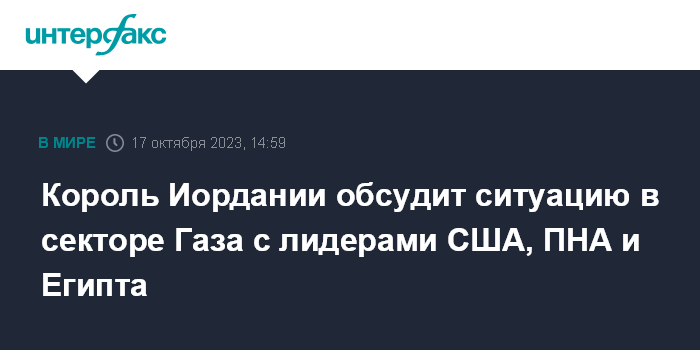 Москва. 17 октября. INTERFAX.RU - Король Иордании Абдалла II проведет 18 октября в Аммане несколько встреч, в разных форматах, с лидерами США, Египта и Палестины для обсуждения ситуации в секторе Газа, сообщили в его канцелярии.