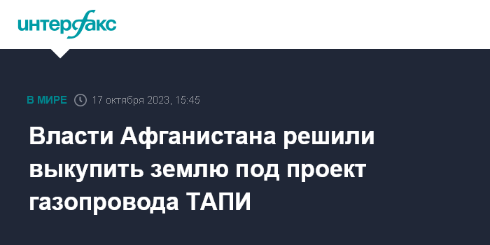 Москва. 17 октября. INTERFAX.RU - Официальный Кабул принял решение о выкупе земли вдоль трассы будущего газопровода Туркмения-Афганистан-Пакистан-Индия (ТАПИ) и готов приступить к практической реализации строительства своего участка магистрали, сообщил афганский новостной канал TOLOnews.
