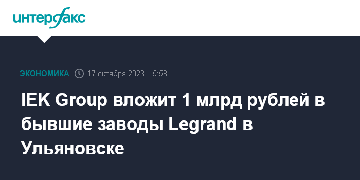 Москва. 17 октября. INTERFAX.RU - Производитель электрооборудования IEK Group (ООО "ИЭК Холдинг"), к которому перешли российские активы французской Legrand Group, намерен за три года инвестировать 1 млрд рублей в развитие этих предприятий, сообщила пресс-служба губернатора и правительства Ульяновской области.