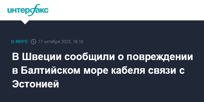 Москва. 17 октября. INTERFAX.RU - В Балтийском море поврежден кабель связи между Швецией и Эстонией, сообщил на брифинге министр гражданской обороны Швеции Карл-Оскар Болин. Об этом сообщает Aftonbladet.