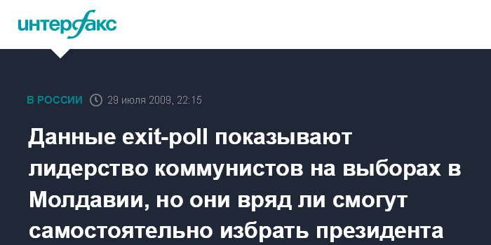 Кишинев. 29 июля. ИНТЕРФАКС - На досрочных выборах в парламент Молдавии лидирует правящая Партия коммунистов, набрав 41,2% голосов, свидетельствуют официальные данные exit-poll.