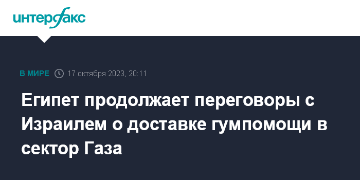 Москва. 17 октября. INTERFAX.RU - Египет по-прежнему ведет переговоры с Израилем на тему того, чтобы пропустить конвои с гуманитарной помощью и топливом в сектор Газа через контрольно-пропускные пункты в Рафахе и Керем-Шаломе, сообщает Associated Press (AP) со ссылкой на высокопоставленного представителя египетских властей.