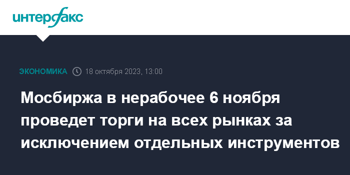Мосбиржа в нерабочее 6 ноября проведет торги на всех рынках за исключением отдельных инструментов