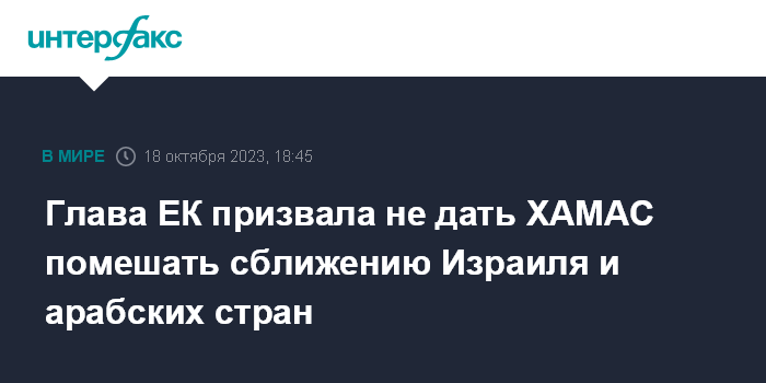 Москва. 18 октября. INTERFAX.RU - Председатель Еврокомиссии Урсула фон дер Ляйен опасается, что действия ХАМАС могут помешать налаживанию отношений Израиля с арабским миром. Она заявила об этом на пленарной сессии Европарламента.
