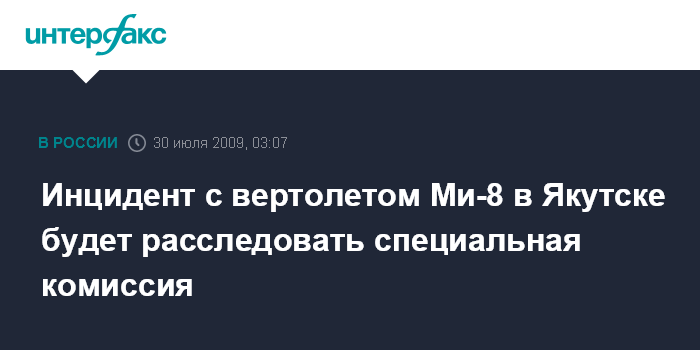 Якутск. 30 июля. ИНТЕРФАКС-ДАЛЬНИЙ ВОСТОК - Для расследования инцидента с вертолетом Ми-8 в якутском аэропорту Маган, произошедшего в среду, в компании "Полярные авиалинии" - владельце вертолета - создана специальная комиссия, сообщили в четверг агентству "Интерфакс-Дальний Восток" в авиакомпании.