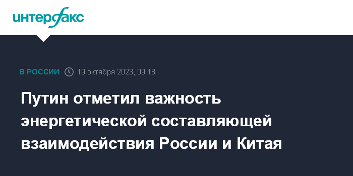 Москва. 19 октября. INTERFAX.RU - Президент РФ Владимир Путин назвал энергетическое сотрудничество одной из ключевых составляющих всеобъемлющего партнерства между Россией и Китаем.