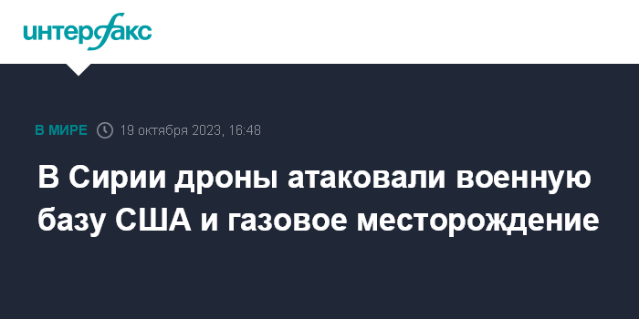 Москва. 19 октября. INTERFAX.RU - В Сирийской провинции Хомс три беспилотника атаковали военную базу США, сообщает "Аль-Джазира" со ссылкой на информационные источники, близкие к сирийской оппозиции. По их данным, военные сбили два беспилотника на подлете к базе, а третий достиг цели и причинил некоторый ущерб на базе.