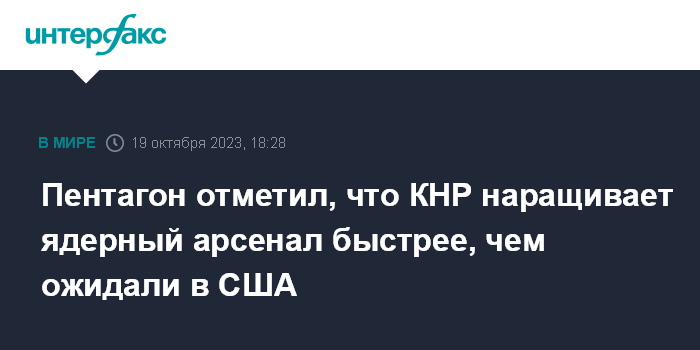 Москва. 19 октября. INTERFAX.RU - Китай быстрее, чем ожидали в Вашингтоне, увеличивает запасы ядерных вооружений; КНР имеет свыше 500 ядерных боеголовок, получит более 1 тыс. к 2030 году, говорится в докладе Пентагона.