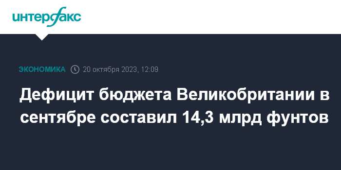 Москва. 20 октября. INTERFAX.RU - Великобритания в сентябре зафиксировала дефицит бюджета в размере 14,3 млрд фунтов стерлингов ($17,3 млрд), говорится в отчете Национального статистического управления (ONS).