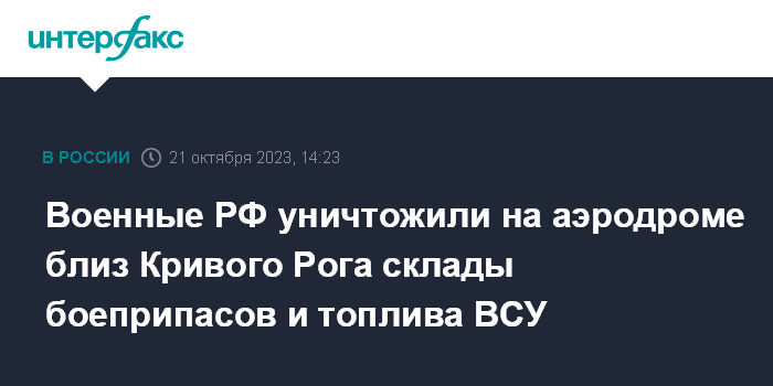 Москва. 21 октября. INTERFAX.RU - Российские военные сообщили, что уничтожили в Днепропетровской области склады топлива и боеприпасов украинских сил.