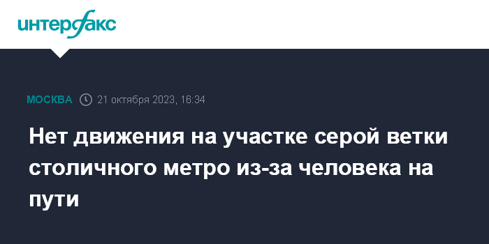 Москва. 21 октября. INTERFAX.RU - Нет движения поездов на юге серой ветки московского метрополитена из-за человека на пути, сообщили в пресс-службе столичного департамента транспорта.